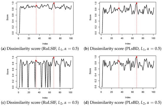 Dissimilarity score plots using RuLSIF and PLsBD methods with and loss functions, employing a mixing parameter of . The analysis was conducted in a single run on Dataset 1. Red dashed vertical lines mark the true anomaly indices.