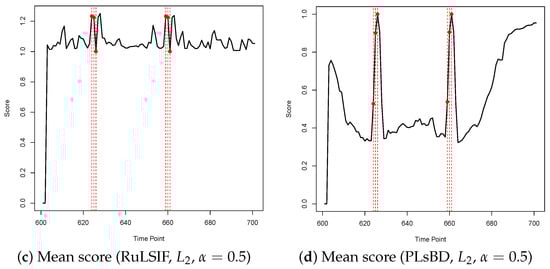 Our findings demonstrate that the performance of RuLSIF and PLsBD is sensitive to the choice of the mixing parameter . Figure 3 presents the dissimilarity scores computed using RuLSIF and PLsBD with . Notably, Figure 3c reveals significant fluctuations in the dissimilarity score when employing the loss function with RuLSIF, whereas PLsBD exhibits comparatively greater stability under the same conditions. The introduction of the mixing distribution aims to address the unboundedness issue; however, a larger mixing rate indicates that the testing data contain too much influence from the training data, potentially diluting the ability to detect anomalies or distributional differences effectively, eventually increasing false positives. Therefore, we selected a smaller value for our subsequent data analysis to enhance performance.