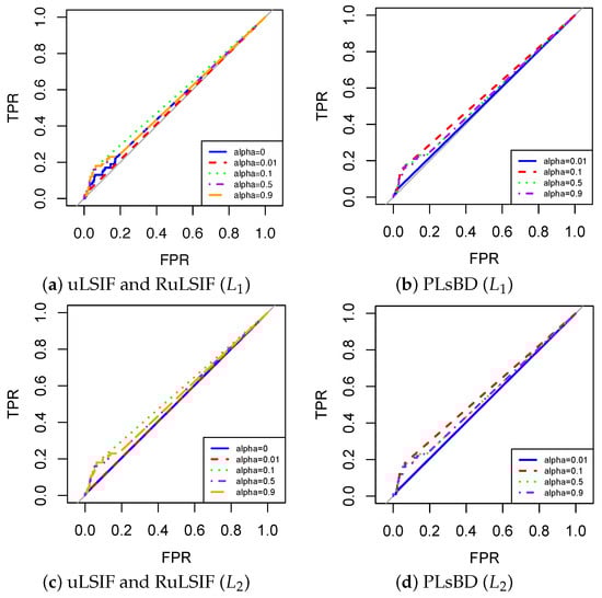 The results in Table 2 show that the scaled Bregman divergence-based methods PLsBD and RuLSIF outperform uLSIF across all datasets with the same parameter settings, including both and loss functions. Previous studies have indicated that the mixing parameter influences the performance of the algorithm. Table 2 confirms that smaller values of (e.g., ) lead to better performance, with larger AUC scores, while larger values of (e.g., ) result in decreased performance. For instance, in the diabetes dataset, both RuLSIF and PLsBD achieve the best performance at with AUC values exceeding 0.55 for both and loss functions. When or higher, the AUC value drops to 0.52. In the simulation data analysis (Figure 1, Figure 2, Figure 3, Figure 4 and Figure 5), the choice of loss function, whether absolute error loss () or squared error loss (), significantly impacts the performance of anomaly detection when the number of anomalies is small. However, in the benchmark dataset, where at least 20% of the data points are anomalies, the results in Table 2 show that the difference in performance between the two loss functions is minimal. Table 3 presents the results for the thyroid and breast cancer datasets, showing trends consistent with the findings in Table 2.