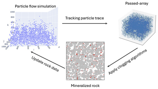 A schematic diagram illustrating the workflow of the particle flow simulation-based clogging model. Particle position tracking from fluid flow simulation is recorded in a passed-array, which is then used to update the rock sample in a single-phase clogging process. Further fluid flow is performed on updated rock. This process is repeated several times, generating a multi-phase clogging process.