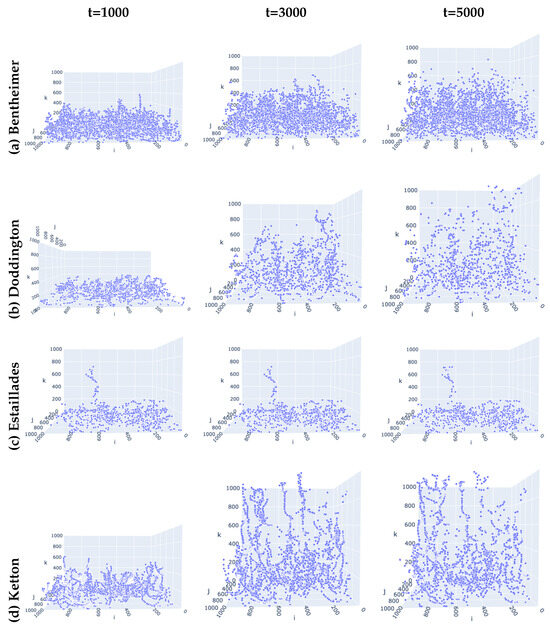 A total of particles is injected into the inlet surface of each rock sample, following the scheme described in Section 3.1. Under the pressure gradient imposed between the inlet and the outlet, these particles will move deeper into the pore spaces. The velocity and dispersion parameters were chosen as , in this study. The simulations are performed for a total of 5000 time steps. With this setting, as , the particles have a much stronger tendency to move along the injection direction compared to the others. In the free lattice—that is, without the grain voxels—the expected position of a particle after 5000 simulation steps along the injection direction is