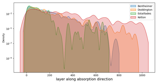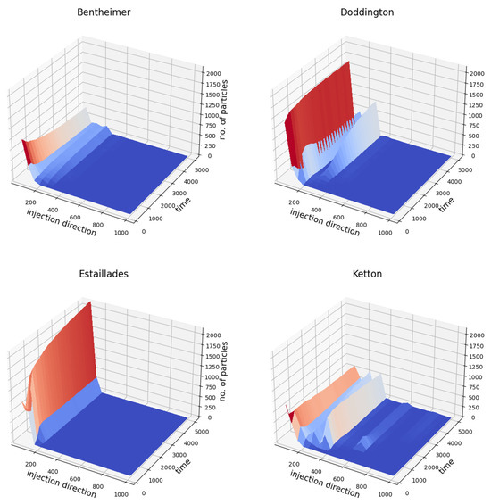 Figure 3 shows samples of the evolution of fluid invading the pore spaces of the rock. During the random walk movement, the particles that reached the outlet surfaces were removed from the simulation for the next random walk step, as they were considered to have escaped. At the end of the simulations, there were no particles escaping from the outlet surface of Bentheimer and Estaillades, while in Doddington and Ketton the numbers of escaped particles were 5 and 581, respectively. Comparing the invading evolutions, we see that among the four rocks, the propagation of the particles along the injection direction increased from Estaillades to Bentheimer to Doddington and, finally, to Ketton. We further investigated the distribution of particles along the injection direction at the end of the simulations, i.e., . Figure 4 shows the kernel density estimates for the distributions. The log scale was used to better distinguish the differences, especially in the long tails of the distributions.