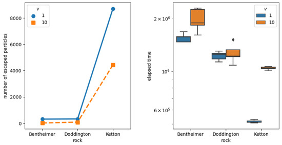 Next, we quantitatively investigated the ability of the particles to invade deeply the pore spaces and the corresponding speed. During the long-term random walk simulation processes with two distinct values of velocity, and , we recorded the number of particles that were able to escape from the outlet surfaces. The results are shown in the left panel of Figure 6. In both cases, no particles were able to escape from the outlet surface of the Estaillades sample within the allotted time t = 5,000,000. Out of the 100,000 particles injected into the pore space of each rock sample, only a small portion were able to escape from the outlet surfaces of Bentheimer and Doddington. The number of particles that were able to escape from Ketton was much larger than those from Bentheimer and Doddington.