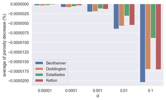 Average porosity decrease taken from 10 independent simulations for each parameter setting with respect to deposition probability q.