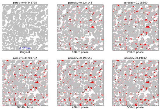 Multi-phase clogging is a consecutive sequence of single-phase clogging. In parameter setting, we predetermine the number of phases to perform. At the end of each phase, some pore voxels become grain voxels because of the deposition; therefore, the porosity and the geometric structure vary. During the simulation process, we use a one-dimensional array, called the position array, to keep track of the position of the particles injected into the pore spaces, and we remove the element from the array when some particles escape from the outlet surface. In addition, at the end of each phase i, the particles that are presented at the precipitated pore voxels will also be removed from the array.