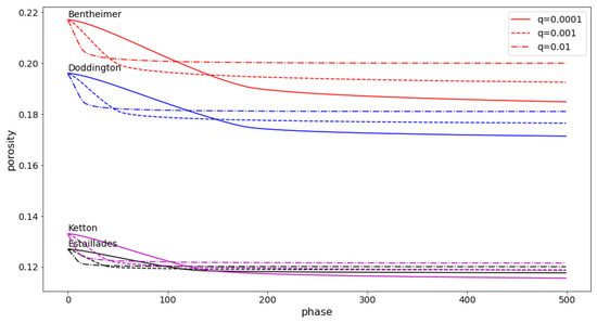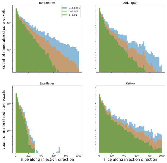 According to Figure 10, when the chosen probability of deposition q was quite large—say, —it blocked the capillaries, which prevented the particles from approaching the outlet surfaces, as seen in Bentheimer, Doddington, and Estaillades. When q was gradually decreasing, the particles reached closer and closer to the outlet surfaces. In Estaillades, even with rather small q, i.e., , there were no precipitated voxels after layer . Therefore, Estaillades may not be an appropriate rock formation to use for geological sequestration. Only in Ketton, even with , did the precipitated voxels reach the outlet surface; this can be explained by its high permeability (see the sub-figures in the last row of Figure 3. One of the reasons for the highest permeability being in Ketton was its relatively high number of medium-size pores compared to the others, as indicated by its right-most (compare to those of the other rocks) shown in Figure A2 in Appendix A. It is observed that geometric properties, such as the physical size of pores, are as important to fluid flow as topological properties like connectivity. Despite having the highest permeability, the mineralized trapping efficiency in Ketton was lower than in Bentheimer and Doddington (by comparing the decrease in porosities in Figure 9. The reason for this may have been partly due to Ketton’s low porosity.