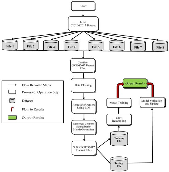 The CICIDS2017 dataset, while comprehensive, contains missing or NaN (not a number) values that require careful handling during preprocessing to ensure high-quality data. The preprocessing began with merging all eight constituent files into a unified dataset before addressing any missing values. Next, duplicate entries were removed, and columns containing only a single unique value were discarded. The remaining NaN values were imputed and leading spaces stripped from feature names for consistency. After these cleaning steps, samples were taken from the dataset. In the case of multi-class classification, the Normal class was removed after sampling. Outliers were then removed using LOF to ensure the dataset was free from extreme values that could have distorted model performance. Then the data were split into input and output variables. Numerical features were then normalized using MinMaxScaler 1.2.2 to ensure consistent scaling across the inputs. Following these preprocessing tasks, the dataset was split into training and testing sets. To address class imbalance, the enhanced hybrid ADASYN-SMOTE technique was applied for oversampling in binary classification and enhanced SMOTE was used for oversampling in multi-class classification to generate synthetic samples within the training set. Moreover, ENN was employed for undersampling the training data, ensuring a balanced class distribution for both binary and multi-class tasks. The preprocessing steps effectively cleaned, balanced, and optimized the dataset, ensuring it was well-prepared for model training and positioned to deliver high-quality and dependable results.