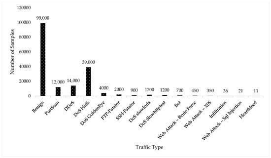 The seven common attack families making up the assaults included the botnet, DoS, DDoS, brute force, web, infiltration, and Heartbleed attacks. Passwords can be cracked, secret information can be found, and attacks may be attempted via brute force attacks. Botnet assaults use internet-connected gadgets to launch spam attacks. DoS attacks overwhelm the system networks and cause the system to become unavailable for a while. DDoS attacks happen when several systems become targets. Web assaults are software programs designed to search for weaknesses in the user system and attack it. A backdoor can be built in an infiltration assault in order to launch attacks on the system once the user system has been exploited. A Heartbleed attack operates by tricking servers into giving up their private encryption key, which then leaks their data. Figure 2 shows the CICIDS2017 dataset’s sample distribution for each class. In the two-stage process, the first binary classification stage is followed by multi-class classification, where removing the normal traffic samples enabling the model to focus on distinguishing between different attack types.