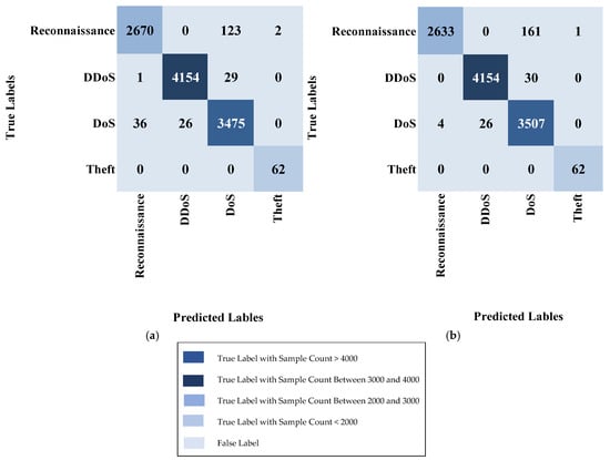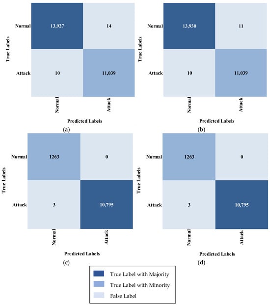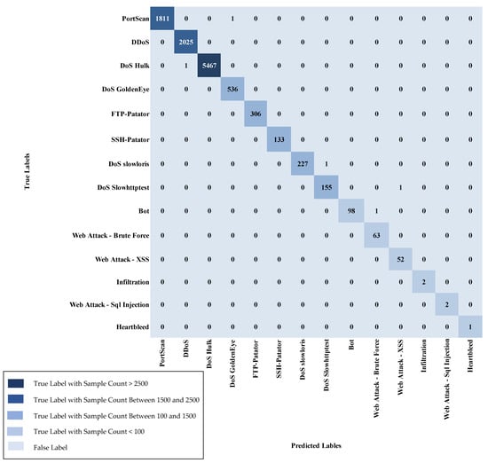 The CICIDS2017 dataset for multi-class classification consisted of multiple attack classes, including PortScan, DDoS, DoS Hulk, DoS GoldenEye, FTP-Patator, SSH-Patator, DoS Slowloris, DoS Slowhttptest, Bot, Web Attack—Brute Force, Web Attack—XSS, Infiltration, Web Attack—Sql Injection, and Heartbleed. The largest class, DoS Hulk, included 31,172 training samples and 5468 test samples, followed by DDoS with 11,519 training samples and 2025 test samples. Other significant classes included DoS GoldenEye, with 3018 training samples and 536 test samples, and FTP-Patator, which contained 1658 training samples and 306 test samples. Smaller classes such as Infiltration and Heartbleed were represented by 13 and 9 training samples, respectively, with even fewer test samples, 2 and 1, respectively. This distribution highlights the varying sample sizes across different classes, with some attack types being more prevalent than others, while rarer attack types like Infiltration and Heartbleed are less frequent, making them critical for testing the model’s ability to detect less common attacks. This variation in class size ensured a comprehensive evaluation of the model’s performance across both major and minor attack types, as shown in Table 7.