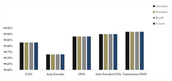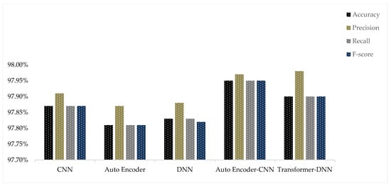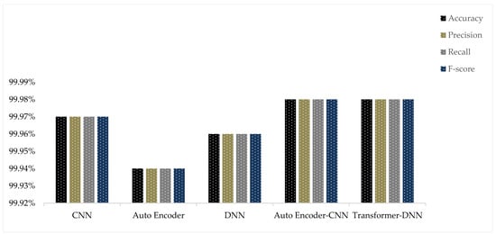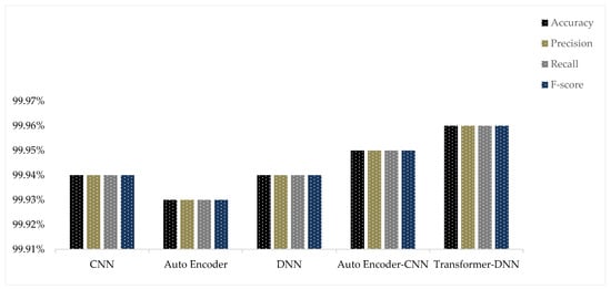 The comparative performances of the proposed Transformer–DNN and Autoencoder–CNN models against other multi-class classifiers demonstrates their exceptional capability in handling complex classification tasks on the CICIDS2017 and NF-BoT-IoT-v2 datasets, as shown in Figure 9 and Figure 10. The evaluation metrics, including accuracy, precision, recall, and F1 score, highlight the outstanding performance of both models. On the CICIDS2017 dataset, the Transformer–DNN achieved the highest scores across all metrics, with an impressive 99.96% accuracy, precision, recall, and F1 score. The Autoencoder-CNN model followed closely with scores of 99.95% in each metric. The CNN and DNN models each achieved 99.94% across all metrics, while the Autoencoder model scored slightly lower at 99.93%. On the NF-BoT-IoT-v2 dataset, the Autoencoder–CNN outperformed the Transformer–DNN, with slightly higher accuracy of 97.95% and precision, recall, and F1 scores of 97.97%, 97.95%, and 97.95%, respectively. The Transformer–DNN achieved accuracy of 97.90%, with precision, recall, and F1 scores of 97.98%, 97.90%, and 97.90%, respectively. The CNN model achieved 97.87% accuracy, with precision, recall, and F1 scores of 97.91%, 97.87%, and 97.87%, respectively. The DNN model achieved 97.83% accuracy, with precision, recall, and F1 scores of 97.88%, 97.83%, and 97.82%, respectively. The standalone Autoencoder scored 97.81% for accuracy, with precision, recall, and F1 scores of 97.87%, 97.81%, and 97.81%, respectively. These results underscore the effectiveness of integrating advanced architectures to enhance classification performance when using imbalanced datasets. The results also demonstrate the superiority of the Transformer–DNN and Autoencoder–CNN models in terms of reliable and efficient multi-class classification on both datasets.
