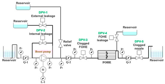 The work presented in this paper is based on a simplified fuel rig designed to represent the Boeing 777 fuel system. Figure 1 illustrates the schematic of the fuel rig, with fuel flow moving from left to right, powered by a pump. Direct proportional valves (DPVs) were employed to accurately simulate degradation within the system, with DPV1 to DPV5 used to introduce and control five distinct failure modes: pump external leakage, pump internal leakage, FOHE (fuel oil heat exchanger) blockage, FOHE leakage, and clogged nozzle. Pressure sensors monitor the system’s pressure, while flow meters track the flow rate.