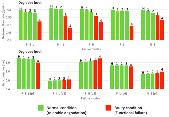 This paper considers five failure modes within the aircraft fuel system (AFS), with their degradation severity outlined in Table 1. Each failure mode was categorised into five levels of severity, including a healthy condition and four progressively degraded states. The degradation process begins at 0% (indicating a completely healthy state) and progresses through specific intervals of degradation. The healthy and early degradation levels are considered tolerable (normal condition), while further degradation leads to functional failure (faulty condition), at which point the affected component requires repair or replacement. The boundaries between normal and faulty conditions were determined based on the impact of each failure mode on the performance metrics of static pressure and flow rate delivered to the engine (Figure 3). The red bars in the figure highlight the severity levels that significantly affect one or both performance metrics, thereby indicating faulty conditions (or functional failures).