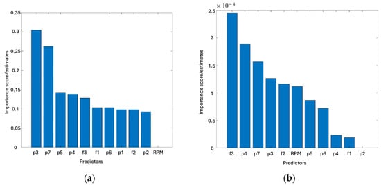 Each dataset comprised readings from eleven sensors: seven pressure sensors, three flow meters, and a laser sensor for measuring pump speed. Two feature selection algorithms, MRMR and tree-based methods, were applied to rank the importance of these features (Figure 4) in predicting the aforementioned 32 classes. However, the results of the two methods differed significantly. As a result, all 11 sensor outputs were selected to serve as 11 features with equal importance for training the ML algorithms. Pressure sensors were strategically placed throughout the system to capture pressure levels before and after key components, while the flow meters were positioned in series along the main pipeline: the first measured the total inflow from the fuel tank, the second monitored the pump’s discharge flow downstream, and the third tracked the flow delivered to the engine. All data were normalised and rescaled to the range [0, 1] to ensure a balanced feature contribution in the ML models.