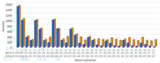 To assess whether each class had sufficient data to train the diagnostic algorithm using these 11 features, the training dataset (comprising 10,938 instances) was categorised by class, with the distribution shown by the blue bars in Figure 5. As depicted, Class 1 contained a substantial amount of data. However, as the number of faults increased, the amount of available training data decreased correspondingly. For instance, when all components were in a failure state (Class 32), only 24 instances were available in the training data.