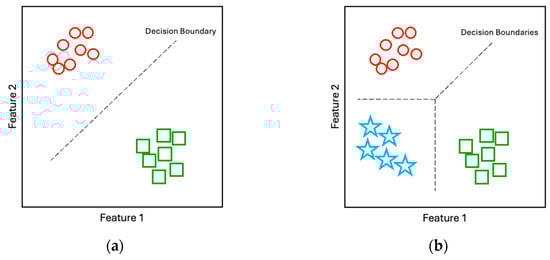 Examples of binary and multiclass classification: (a) binary class classification; (b) multiclass classification.