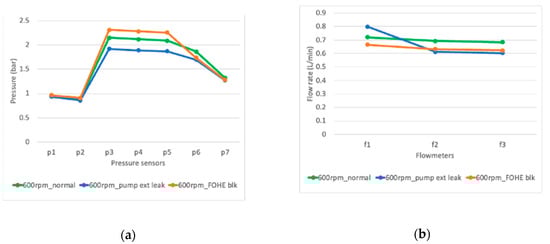 Figure 8. Symptom vectors of three health conditions: (a) pressure profiles; (b) flow rate profiles. - Residual calculation and interpretation. Residuals from the symptom vectors produced a 31 × 10 matrix for each pump speed, highlighting deviations between each faulty class and the normal condition. For example, Table 3 records the residuals for nozzle blockages (Class 2). Engineering knowledge interprets the resulting backpressure as an increase in downstream pressure (p3 to p7) and a reduction in flow rate (f1 to f3). Such correlations between engineering principles and residual data underpin the interpretability of diagnostic models.