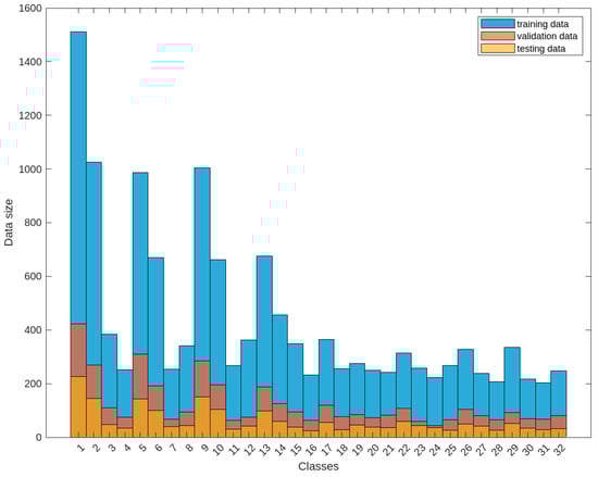 Before finalising each algorithm’s configuration, including model structure and hyperparameters, preliminary evaluations were performed using an independent test set comprising 10% of the total dataset, instead of cross-validation. This approach was adopted due to the ample data generated by the simulation model for ML. The entire dataset was randomly divided into three subsets—training, testing, and validation—ensuring that each subset had a similar distribution and included all 32 classes. Figure 9 highlights the test set using the yellow color and illustrates the quantity of data for each class within it.
