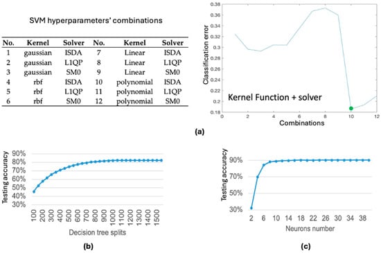 A straightforward approach was then employed in the MATLAB R2024a environment to tune only one to two hyperparameters that significantly impacted algorithm performance based on accuracy with the test data. All other parameters were kept at their default values. For the logistic regression, no hyperparameters were identified as substantially affecting performance. In the case of the SVM, the choice of kernel functions and solvers significantly influenced performance, with MATLAB offering four kernel options and three solver options, as summarised in Figure 10a. The key hyperparameters for decision trees (DTs) and artificial neural networks (ANNs) were the number of decision nodes and neurons in the hidden layers, respectively.