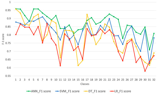 All four evaluation metrics indicate that the ANN outperformed the other models, correctly classifying 90% of the samples, while the logistic regression (LR) showed the weakest performance. Figure 11 provides a detailed view of the F-1 score distribution across classes for the four selected ML methods, with the F-1 score being the only metric capable of offering class-level detail. The average F-1 scores in Table 5 correspond to the values in Figure 11. The ANN achieved the highest F-1 scores in nearly all classes except for Class 12 and 17. Conversely, the LR exhibited the lowest F-1 scores in most classes, with only seven exceptions. The F-1 scores of the SVM and DT generally fell between those of the ANN and LR, although the DT’s average score was notably lower than that of the SVM due to higher variability across classes. Specifically, the DT’s performance was particularly poor in certain classes, including Classes 11, 15, 16, 30, and 31.