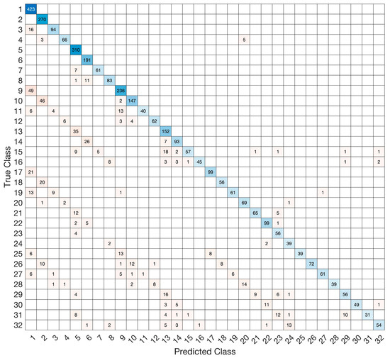 Figure 12 presents the confusion matrix for SVM results on the validation dataset. In this matrix, rows correspond to the actual classes, while columns represent the SVM’s predicted classes. Correct predictions are highlighted in blue, and incorrect predictions are highlighted in red. The color intensity indicates the number of cases in each cell.