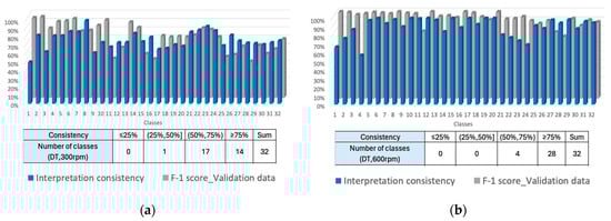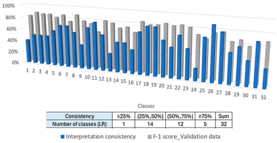 In Figure 13, the horizontal axis represents the 32 classes, while the vertical axis shows the results as percentages. The blue bars represent the consistency between the signs of the logistic regression (LR) parameters fitted for each class (as shown in Table 8, representing the LR’s interpretation) and the corresponding engineering insights in Table 3. The grey bars depict the F-1 scores of the LR on the validation dataset. The table below the graph summarises the distribution of the consistency levels across classes. This consistency varied significantly among classes and was low (≤50%) in nearly half of them, resulting in an average interpretability of only 58% for the LR. Additionally, the LR’s predictive performance, shown by the grey bars, was weaker than that of the other three algorithms, as indicated in Figure 11.