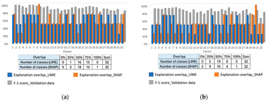 The table in Figure 15 summarises the number of classes at each level of overlap. Compared to the SVM (Figure 15b), the ANN (Figure 15a) had more classes with high interpretability, defined as an overlap of 75% or greater. Based on these tables, LIME provided slightly better interpretability than SHAP for the ANN and the SVM, achieving 61% and 52% overlap, respectively. Thus, among the combinations of XAI techniques and opaque algorithms in this study, LIME provided the highest interpretability with the ANN, while SHAP offered the lowest interpretability with the SVM.