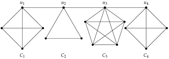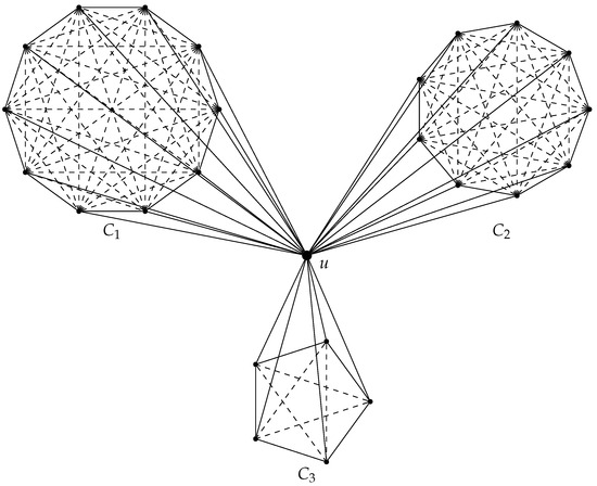 We define star of cliques as a connected graph comprising n vertices distributed across k cliques , where each clique contains vertices for all . The sizes of the cliques are ordered such that . Furthermore, the graph includes a universal vertex u, which is directly connected to all other vertices in the graph. Figure 1 illustrates an example of a star of cliques consisting of three cliques with sizes 10, 9, and 5.