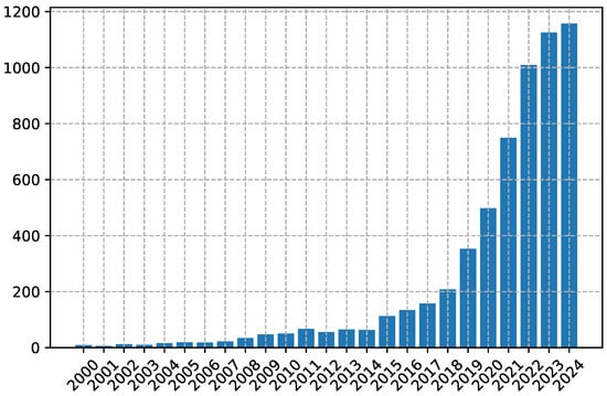 The yearly publication count since 2000 is shown in Figure 1. It can be noticed that the number of published papers has significantly increased, starting in 2015, since when it has become stably higher than 100 per year. Starting in 2022, the increasing rate has been lowering and the number has progressively stabilized.