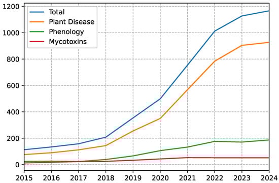 Figure 2 shows the number of papers containing each of the three agronomic keywords appearing in the search query. As can be seen, the majority of authors concentrate on algorithm application to plant diseases and phenology, with a research trend that follows the general one. Mycotoxin studies are less present but more numerically constant over the past decade.