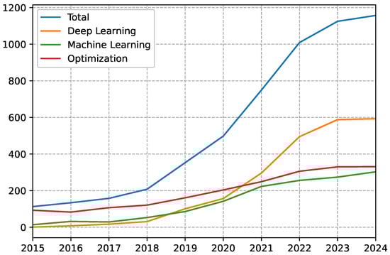 Concerning the different categories of algorithms, the situation is summarized in Figure 3. Deep learning has played the most important role during the past five years, with a constant and significant increase in papers, while machine learning was applied more frequently before 2019. The usage of all algorithms has increased over the years. Optimization employment has been more stable over the past ten years. The comparison between the optimization and machine learning curves shows how optimization examples can be found without a direct application in machine learning.