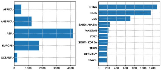 Histograms showing the geographical distribution of papers indexed in the Web of Science (WoS) by country of application during the period 2015–2024. Left: summary per continent. Right: the top 10 countries in the list.