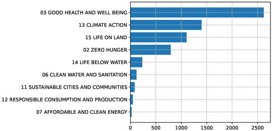 The data can also provide an overview of the distribution of records across different Sustainable Development Goals (SDGs), of which “03 Good Health and Well Being” stands out as the most prevalent goal, representing 43.3% of all records, followed by “13 Climate Action” with 23.1%, “15 Life on Land” with 18.2%, and “02 Zero Hunger” with 13.1%. These high percentages indicate a significant focus on health, environmental, and climate-related themes in the dataset. Other SDGs contribute to the dataset, albeit to a lesser extent (Figure 5).