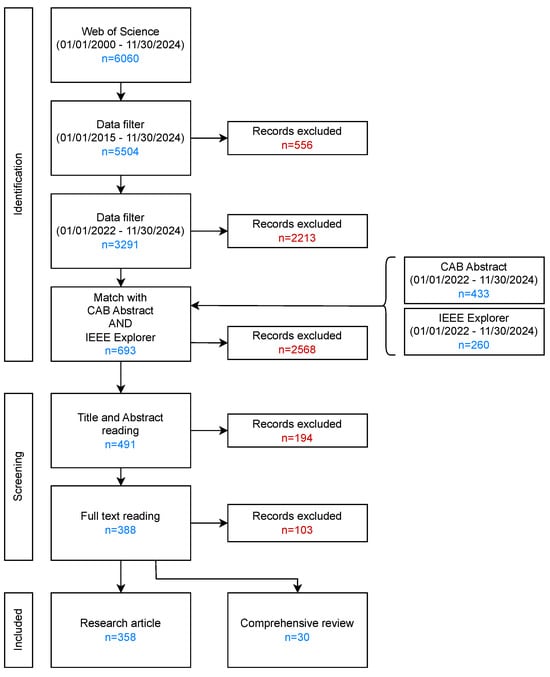 The flow diagram applied to the paper selection is shown in Figure 6. The first paper selection was performed by running on the WoS search engine the query reported in Section 2.1. The results were filtered to the period between 1 January 2000 and 30 November 2024, obtaining 6060 papers. On a subset of this preliminary selection, all preliminary generic statistical analyses were carried out by applying a 10-year filter from 1 January 2015 to 30 November 2024, obtaining 5504 papers; the results are reported and discussed in Section 2.1. As is shown in Figure 1, the majority of the papers are concentrated in the past 3 years, so a more selective date filter was applied, between 1 January 2022 and 30 November 2024, obtaining 3291 papers. To refine the search, the query was run on two additional search engines, CAB Abstract and IEEE Xplore, and then filtered to the same period. The two searches yielded 433 and 260 papers, respectively.