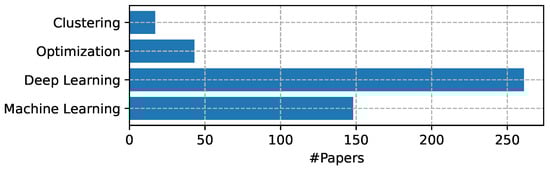In Figure 7, the usage count of papers by group is reported, confirming that machine learning and deep learning are very hot topics among researchers. On the contrary, the usage of optimization algorithms is limited, with the exception of their application as the backbone of other methods.