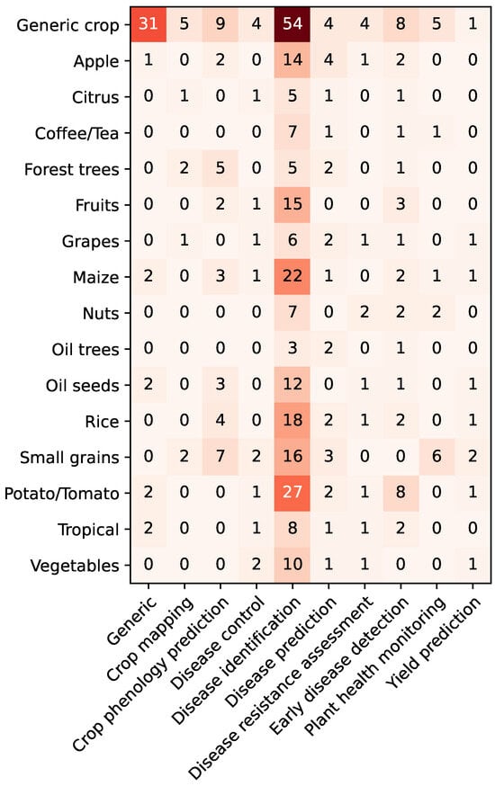 Figure 8 shows the combinations of crops and agronomic aims that were found in the analyzed articles. The interest towards disease identification is dominant, while few papers treat other agronomic aims. Regarding the combination with crops, the group tomato/potato has the highest number of papers, 27, on disease identification, with a further 8 papers where the focus is on early disease detection. Maize (22), rice (18), and small grains (16) follow in the disease identification category, confirming the relevance of cereal studies. It should be noticed that 54 papers concentrate on disease identification without focusing on a specific crop, opening the method applicability to a wide range of cultures.