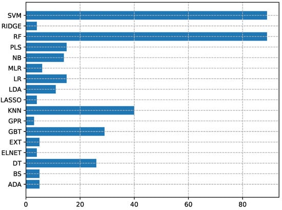 In the “machine learning” group, we classified all models and meta models (ensembles) that implement supervised and semi-supervised algorithms. Models, once trained on a given labeled dataset, can be used to solve classification or regression problems. Because of the huge amount of predictors, to limit acronym pollution, we considered algorithms with different model specializations as a single one; e.g., the K-Nearest Neighbors Regressor and the k-Nearest Neighbors Classifier are reported as the same algorithm. In the same way, variants based on different kernels or likelihood distributions were grouped under the same label. Meta models are estimators that combine the prediction of several base models, trained in different ways, to produce a more robust and accurate prediction output, such as voting, bagging, boosting, and stacking.