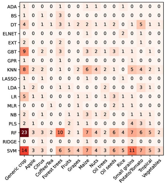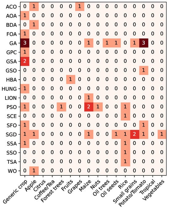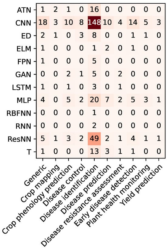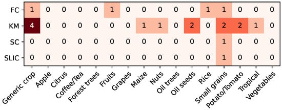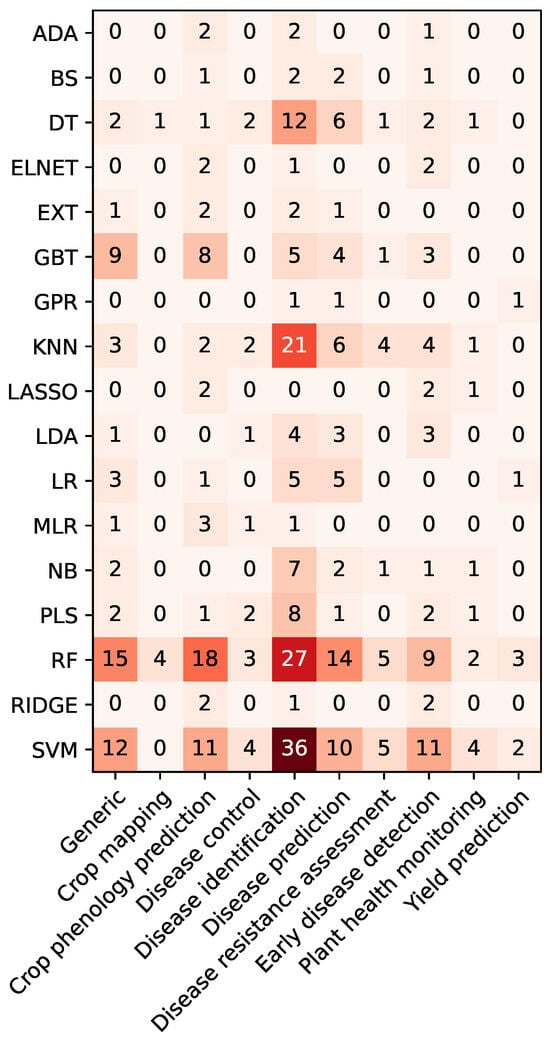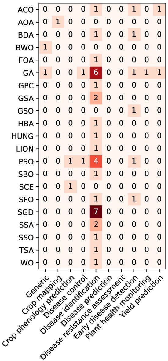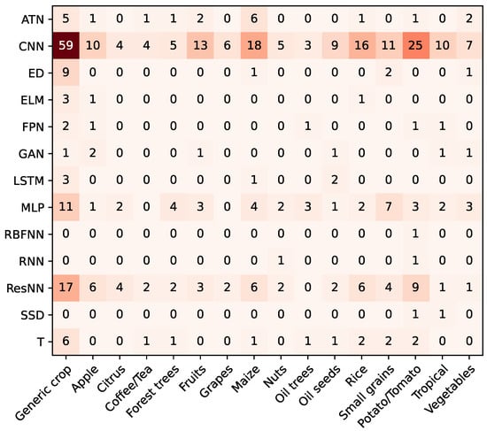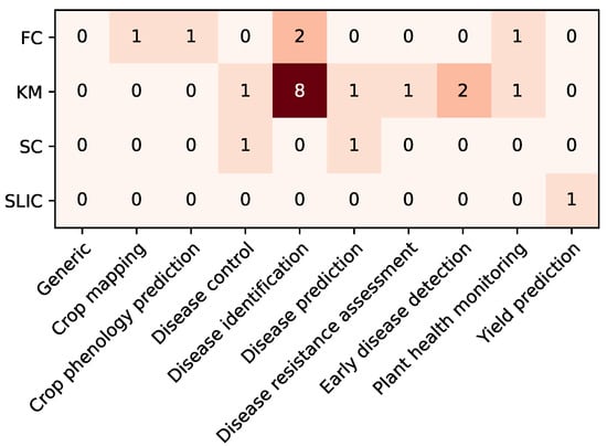 The same approach was applied to categorize the crops in which the algorithms are used. Specifically, 16 categories were established as follows:
