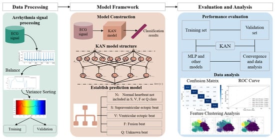 This study seeks to classify ECG signals for the diagnosis of various arrhythmia diseases using an interpretable KAN. The methodology comprises three primary components: data preprocessing, model architecture, and evaluation analysis. Sample balanced and variance sorting are employed to preprocess ECG signals. Subsequently, the classification performance of ECG signals is compared between the KAN and MLP models, highlighting the advantages of the interpretable KAN model through data analysis techniques such as feature clustering and fuzzy matrices. Figure 1 outlines the entire workflow, which is elaborated upon in subsequent sections.