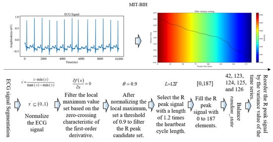 The original data were segmented using a 10 s time window, followed by normalization, filtering of the maximum value set for first-order derivative zero features, threshold-based filtering of the R-peak candidate set, setting a 1.2 T heartbeat cycle, and standardizing to a uniform dimension. Additionally, feature extraction was conducted using a combination of sample balanced and variance reordering.