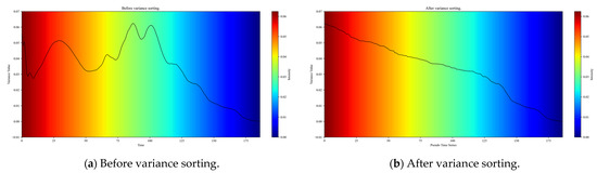 Each selected segment was zero-padded to ensure a fixed length of 188. The range [0, 186] represents the ECG signal, while the 187th position serves as the arrhythmia category marker. Variance feature analysis was applied to both the original and sample-equalized ECG data. For both data types, the datasets were reordered based on the variance of their time series. This reordering resulted in a pseudo-time series representation of the ECG. Figure 3 illustrates the time feature distribution before and after sorting.