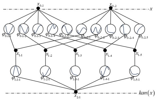 In the Kolmogorov–Arnold representation theorem [5], a KAN layer is composed of several internal functions. For example, Equation (1) is composed of two KAN layers. The shape of the KAN is represented by an integer array as . is the number of nodes in the -th layer of the computational tree, and is used to represent the -th neuron in the -th layer. There are activation functions between the layer and the next layer (). The activation function connecting and is