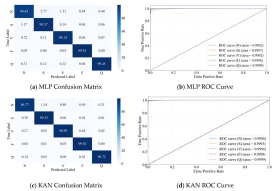 Consequently, in classifying arrhythmia diseases using ECG signals, the KAN demonstrates higher accuracy and superior robustness and fitting stability than MLP. This analysis underscores the KAN’s superiority in handling ECG signal classification tasks, as evidenced by its overall performance and accuracy fitting. To evaluate the classification performance for specific categories of heart failure, we plotted the confusion matrix [24] and ROC curve [25] for the MIT-BIH dataset after balanced and variance sorting, highlighting the KAN’s superiority in classification precision across various heart failure categories, as shown in Figure 5.