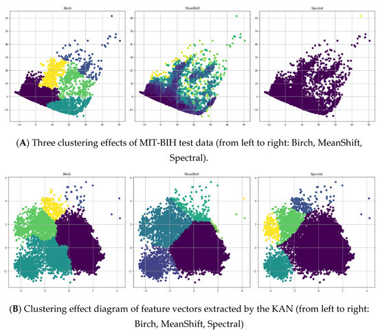 This study applies three clustering algorithms to the original MIT-BIH dataset and the feature vectors output by the KAN for comparison. The experimental results are illustrated in Figure 6. A comparison of the clustering effects reveals that the performance on the original MIT-BIH dataset under the MeanShift and Spectral algorithms is suboptimal. The data boundaries are indistinct, with significant overlap between multiple clusters, making effective differentiation challenging, as depicted in Figure 6A. Notably, under the Spectral algorithm, only one cluster is discernible, indicating that the dataset’s graph features are insufficient to support effective clustering.