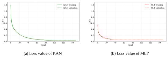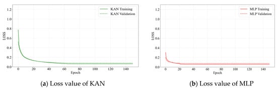 The convergence characteristics of the KAN and MLP models were compared using both the original MIT-BIH dataset and the dataset after balanced and variance sorting, as shown in Figure 7 and Figure 8. The KAN converged after approximately 80 training epochs, whereas the MLP model stabilized and reached convergence within about 30 epochs. Although the MLP model demonstrated a faster convergence speed, the KAN exhibited superior stability in loss reduction, with a significantly lower final convergence value compared to MLP. This indicates that the convergence trend and final loss value of the KAN are more favorable than those of MLP. Additionally, the loss curve of the KAN displays a stable and smooth downward trajectory, reflecting its enhanced robustness and stability when handling complex or noisy data.