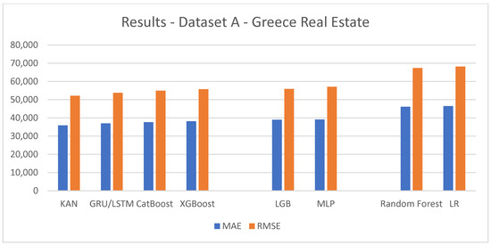 Beginning with the data cleaning process, dependent columns, such as price per square meter, and columns that showed no statistically significant correlation (e.g., parking) were removed. Also, rows that contained empty fields were removed. Additionally, 5% of the outliers with respect to the price were removed, including the minimum and maximum values. Categorical variables were encoded using one-hot encoding and ordinal encoding techniques. Numerical variables were standardized using a standard scaler. Table 2 and Figure 3 below demonstrate the results sorted by performance (error), showing KAN outperforming significantly all of the existing state-of-the-art approaches. Figure 4 presents a comparison plot between the values predicted by KAN and the actual values.