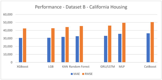 In contrast, on the default California Housing dataset, traditional machine learning models such as XGBoost and LightGBM emerged as the top performers. XGBoost achieved the lowest MAE (30,625), RMSE (42,477), and SMAPE (15.81%), closely followed by LightGBM. While KAN remained competitive, it recorded slightly higher metrics, with an MAE of 31,961, an RMSE of 44,191, and an SMAPE of 16.45%. These results suggest that the relatively small size and limited feature set of the California Housing dataset may constrain the full potential of neural-network-based models like KAN.