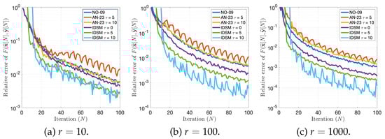 where is the vector in , all of whose components are 1. We generated matrices for each randomly, where its entries were independently and uniformly distributed in the interval . We compared the IDSM with the existing methods NO-09 and AN-23. We set the delay sequences with the cyclic order delays for all and , with the delay bounds , and 10 for both the IDSM and AN-23. We set the step-size constant as for the IDSM and for AN-23 and NO-09. We performed 100 independent random tests and terminated all tested methods when the number of iterations reached 100. We examined the considered problem in various problem sizes , as detailed below.