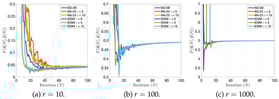 In Figure 1a–c, we consider the behavior of the average of 100 independently sampled function values with a fixed . We observed that for all values r, all methods tended to converge to the saddle values.