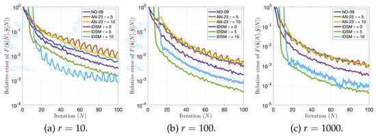 According to Figure 2, which shows the behaviors of the relative errors of the function value for each problem size, we noticed that the IDSM with an appropriate delay bound selection, particularly for a fixed delay bound of , provided the most accurate results with the lowest relative error across all sizes. Additionally, for fixed delay bounds of and , it still exhibited lower relative error values when compared with the AN-23 and NO-09 methods.