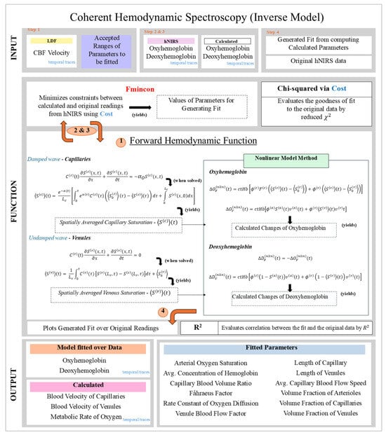 Outputs: Fitted parameters, reconstructed [HbO2] and [HHb] time traces, and derived oxygen saturation dynamics for capillaries and venules. Figure 1 depicts the Flowchart of the non-linear CHS model workflow.